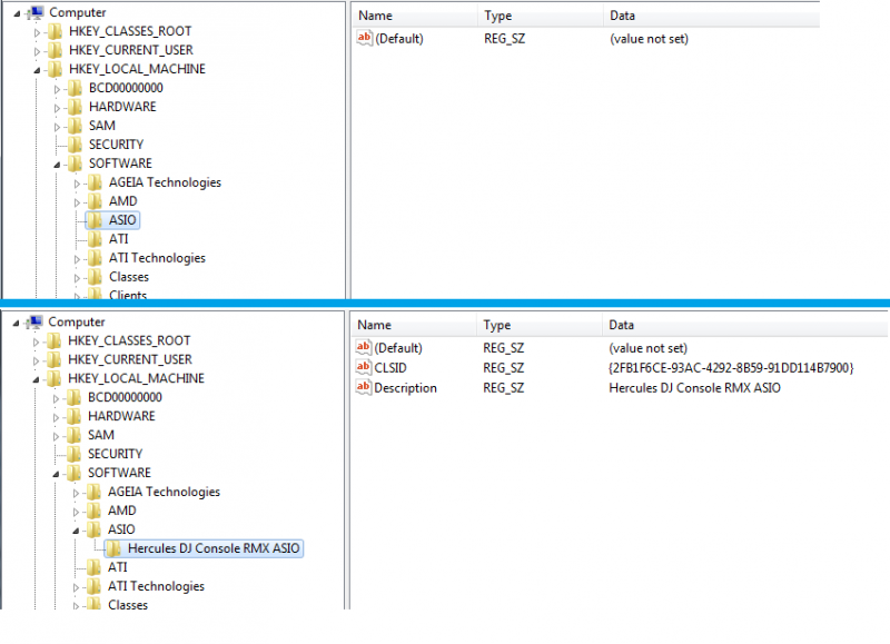 - Sous HKEY_LOCAL_MACHINE\SOFTWARE, devrait se trouver une dossier ASIO contenant une clé pour ta console Hercules DJ Console Rmx ASIO si ta console est en mode ASIO.