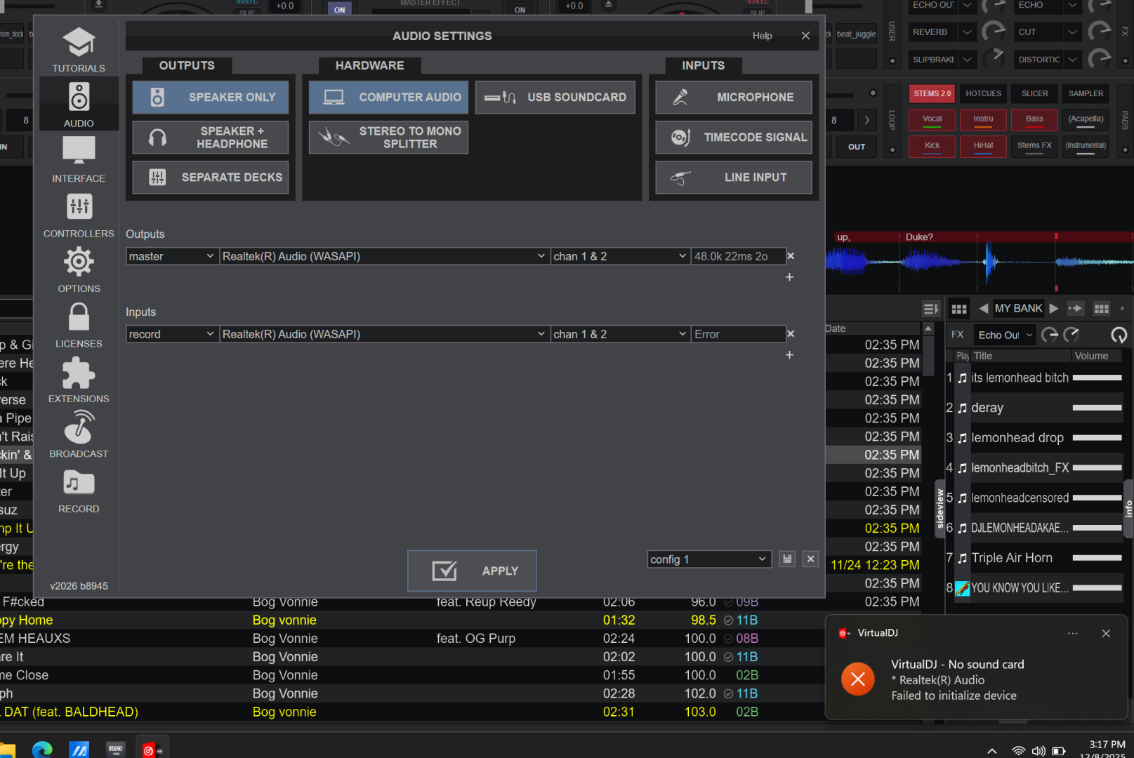 I updated to Virtual DJ 2026 and now it wont recognize the internal soundcard. Works just fine when controller is connected. I restarted and changed the audio settings but still nothing. I also tried the exclusive access option & still doesnt work.