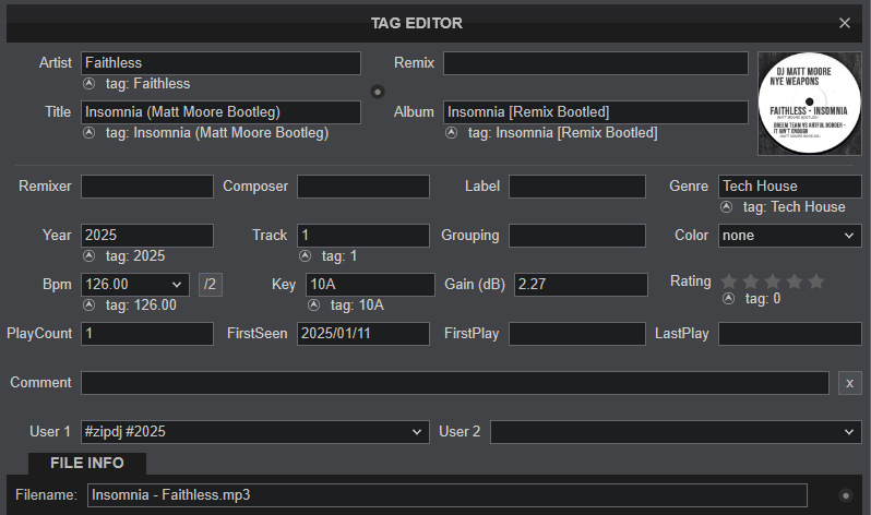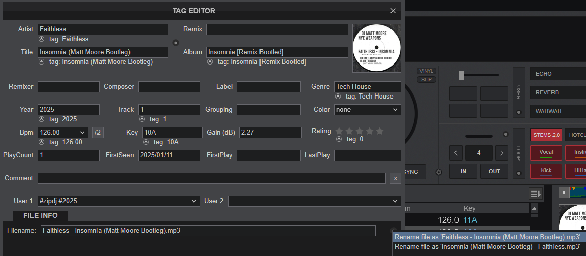 Also if i rename certain files in the tag editor, the first option is "artist - title (remix)" it renames the correctly the second option "title - artist" it renames the file without (remix) although the remix is already in the title.