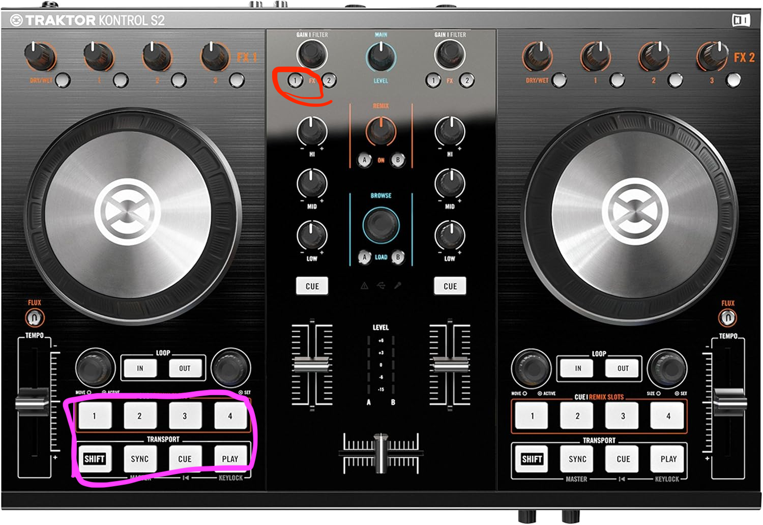 I would like to program by FX 1 (circled in red) to toggle on and off, changing my pad section to the slicer, then being able to use the 8 keys (shown in pink) to correspond to the 8 keys on the slicer. And going back to the original stems 2.0 and restoring the function of the play, cue, and hotcues as factory.