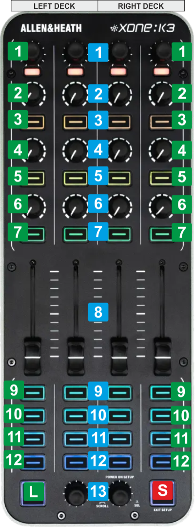 The left side of the Xone K3 offers controls for Left Deck and the right side controls for the Right Deck.