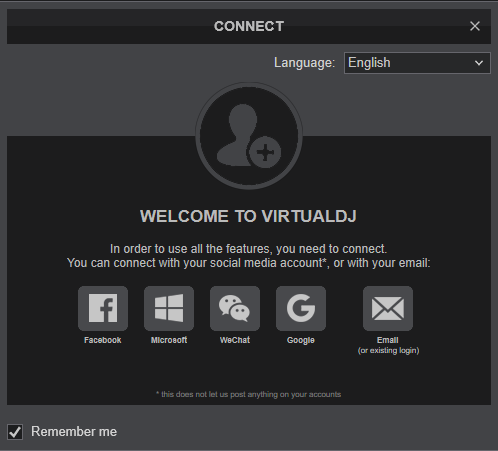 Once VirtualDJ is opened, a Connect Window will appear. Login with your Account’s credentials.