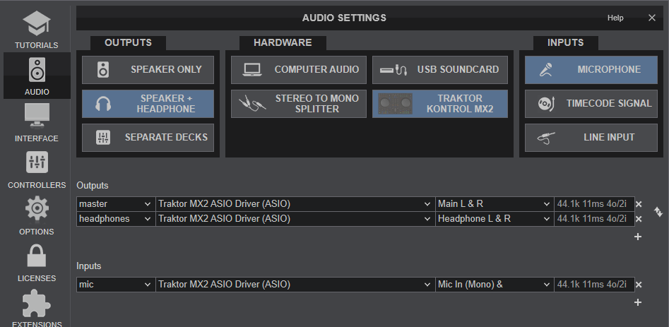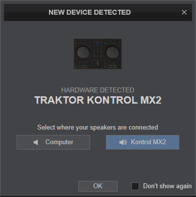 Select the Kontrol MX2 button in order VirtualDJ to apply the pre-defined audio configuration (speakers need to be connected to the rear side of the device in this case), or Computer if you don't have any speakers to connect to the Kontrol MX2 and need to output sound from the default sound card of your computer.