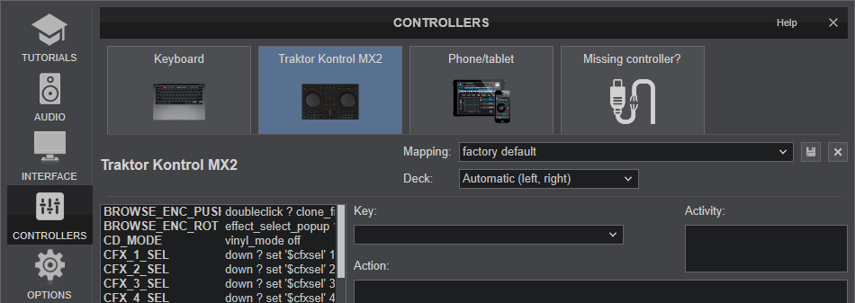 The device should be visible in the CONTROLLERS tab of VirtualDJ Settings and the “factory default” available/selected from the Mappings drop-down list.