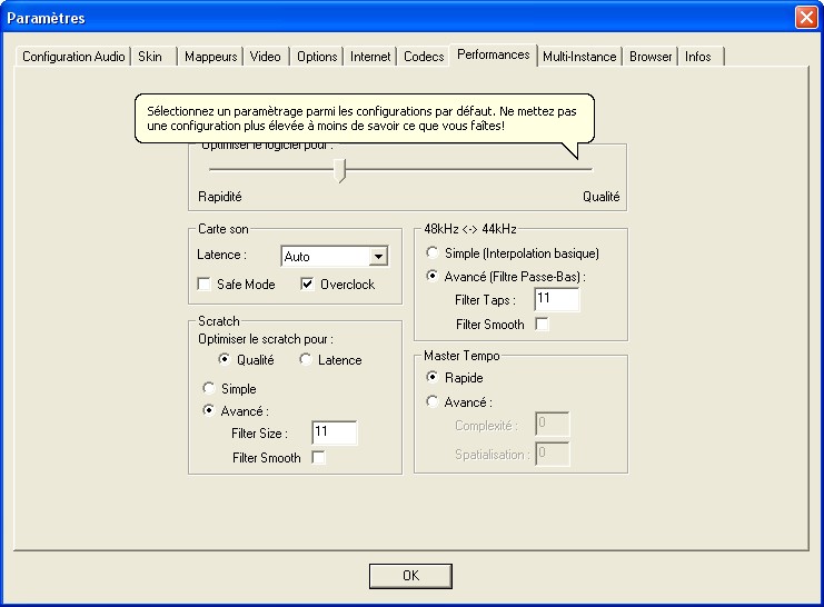 Je reviens vers le peuple VDJ en me prosternant devant lui .............. En effet je suis repassé sur la version 5.2.1 !!! Apres avoir essayé la version 6 et 6.01 (je prefere ne pas tenter la 6.02 pour garder une santé mentale correct ;-). Les reglages de Mon onglet performance se sont modifiés tout seul ! si si...... Du coup je ne retrouve plus mon precedent reglage (c'est pas bien) et le son accroche à tout va !!!!