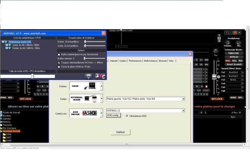 Dans la config de VDJ sélectionne que la carte son maya 44, ne te sert pas d'ASIO4all et décoche Ultra latency asio