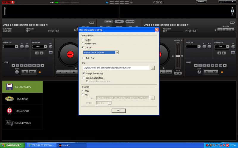 DJ MIX MAC, je ne suis pas en Line in, mais en master ( enfin j'ai à peu près tout essayé, Master+Mic, Line in, avec differente carte son, PC et asio), en file, je suis en Prompt if overwrite et en format en WAW.