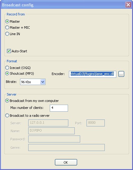 - Dans la partie sever, clic sur (Broadcast to a radio sever) et tape 8000 dans la case Port,