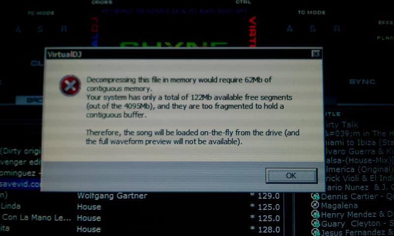 At the time of trying to load the track you had 122Mb of RAM available out of 4096Mb (4Gb) for VirtualDJ to use and load the track - but that available MEMORY (RAM) space was to fragmented and didn't have 62Mb of contiguous memory addresses available for VirtualDJ to load your track in memory.
