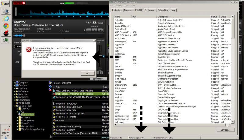 From your screen shot it shows 40 processes loaded - what are those processes? Are all of them necessary while using VirtualDJ? Things like 'real-time' diagnostic applications, anti-virus, etc - could be fragmenting your System RAM - therefore creating a performance issue in the management of System RAM.