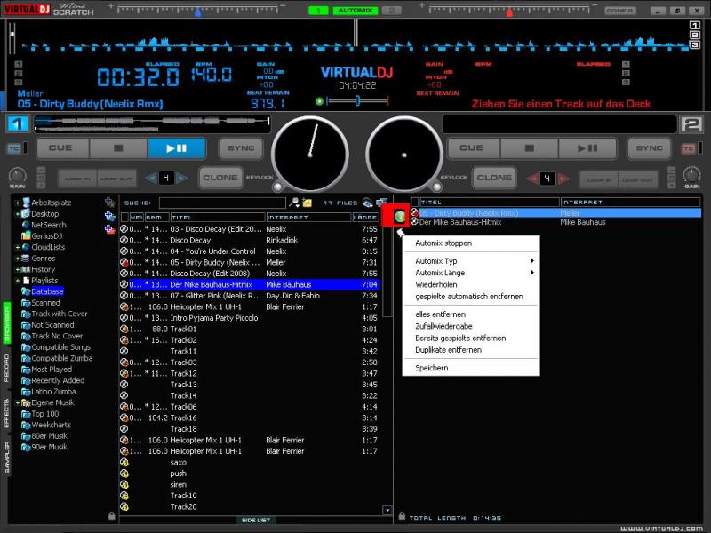 Im Miniscratch Skin kannst du auch den Automix über den Button oben in der Mitte aktivieren,wenn ein Titel in einem Deck am laufen ist und ein weitererTitel oder mehrere in der rechten Browserleiste eingefügt ist,der Mixt dann alles automatisch ab nach der Einstellung die du vorgenommen hast.