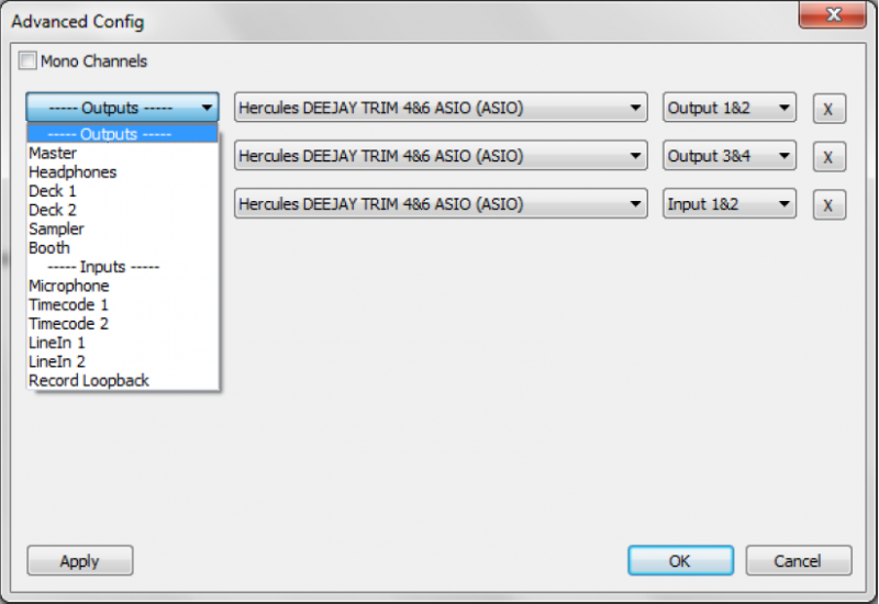 pour pouvoir enregistrer avec VirtualDj il faut passer en Advenced config dans config de carte son de vdj et configurer chaque canal comme sur le screen en dessous