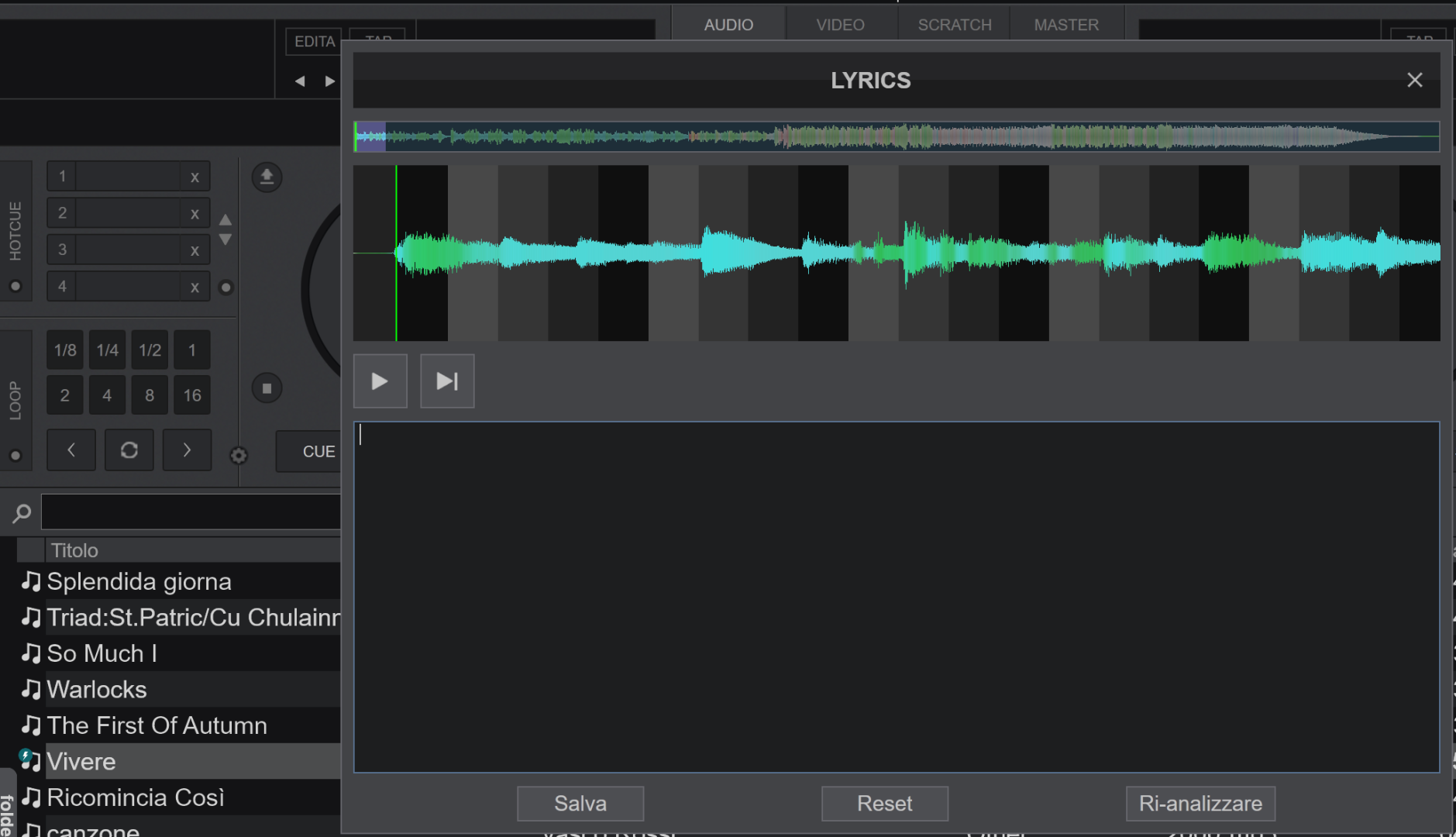 se lo carico nel deck e riapro l'editor lyrics ecco che produce i testi.