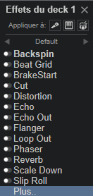Il y a une liste défaut (effets par défaut dans VirtualDJ), une liste de tous les effets legacy + effets installés + les nouveaux effets Pioneer et Rane :
