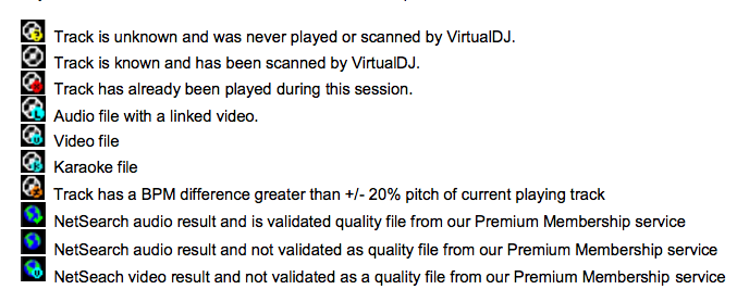 Look in the VirtualDJ User Guide on page 7 - it explains all the symbols used for track status identification