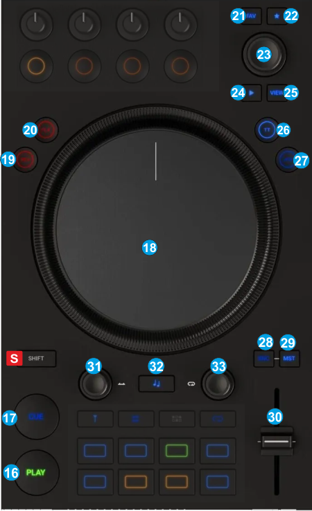 14. MST: Use this button to manually set the Deck as Master (all other Decks will be synced to this one)