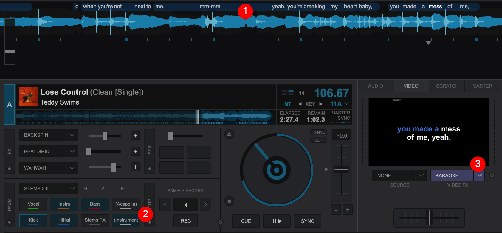 - KARAOKE VIDEO FX. From the Video Mixer panel, select and activate the Karaoke VideoFX. This will display the extracted lyrics on the video output with a guide vocal for the singer.