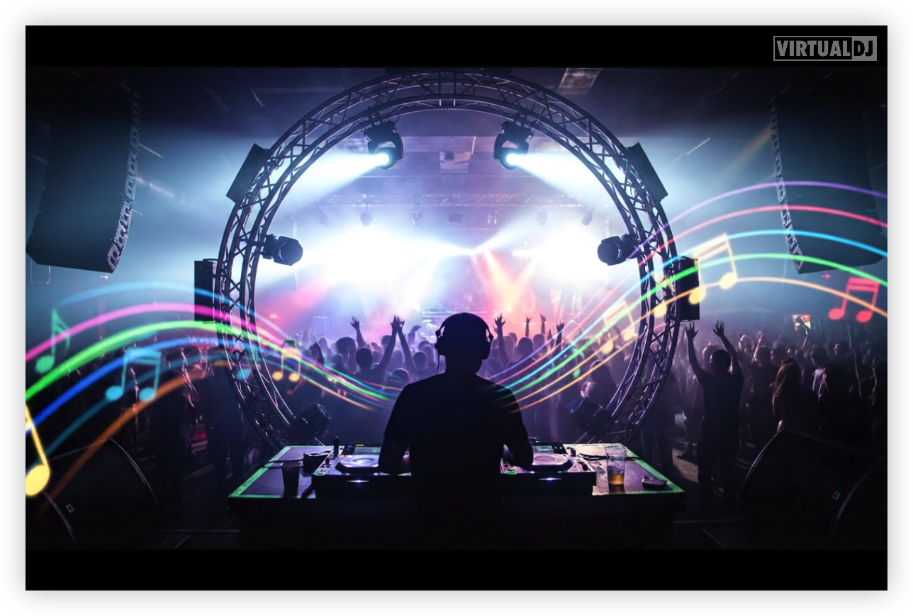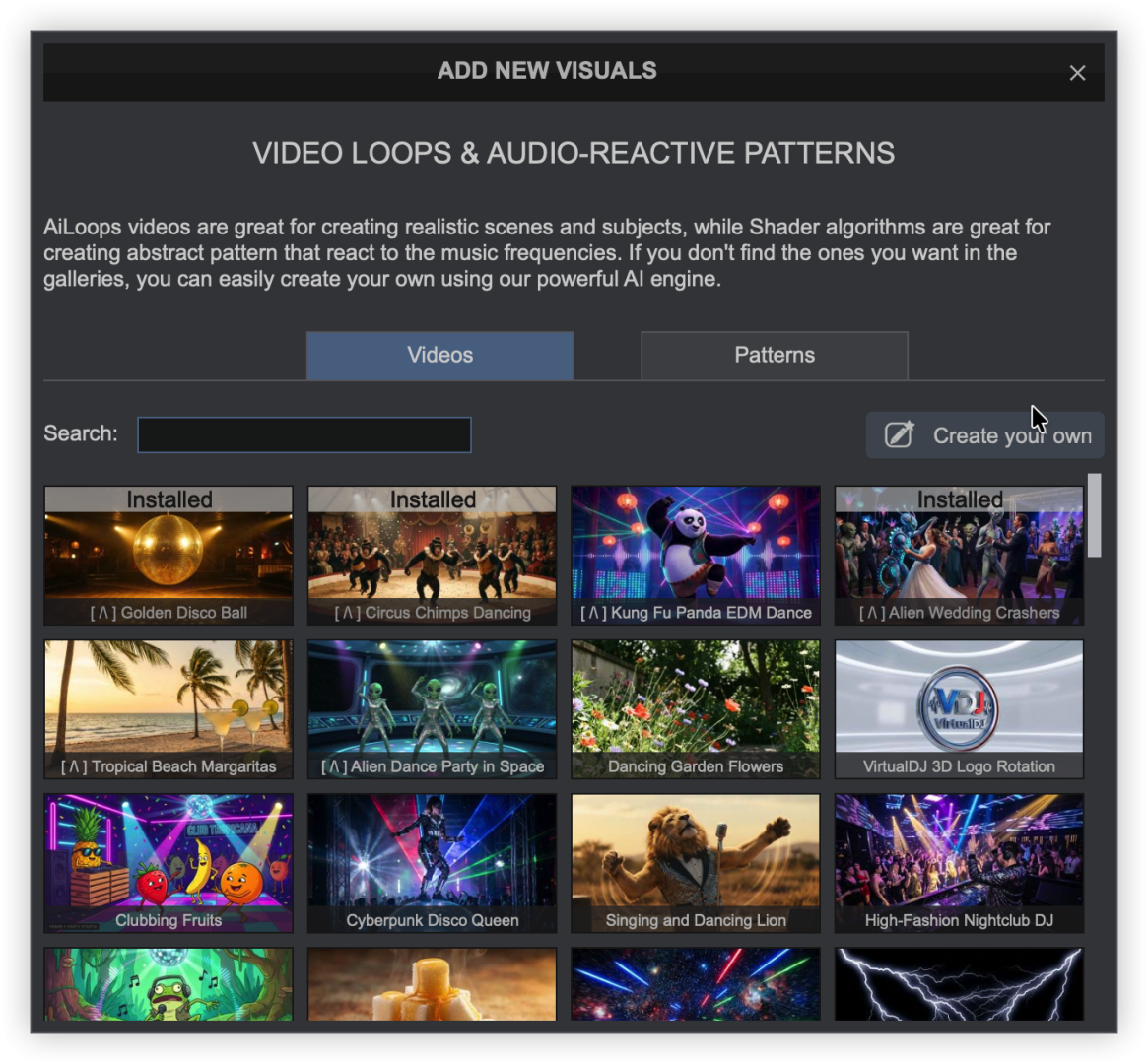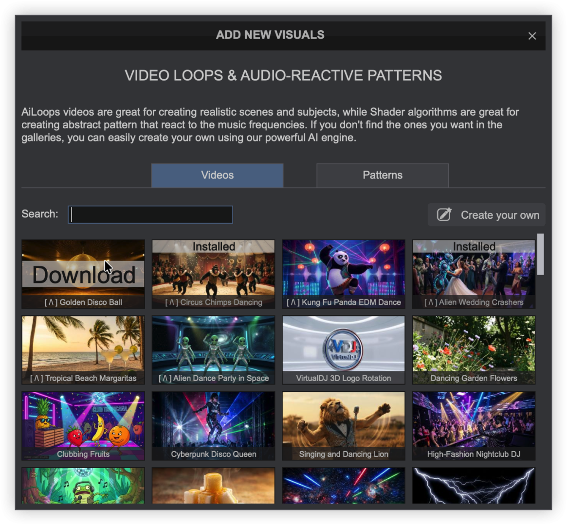 Visuals provide the ability to display AI video loops and audio-reactive patterns on the master video output that move with the music in real time. Visual content can be downloaded from a user-created library or created within VirtualDJ.