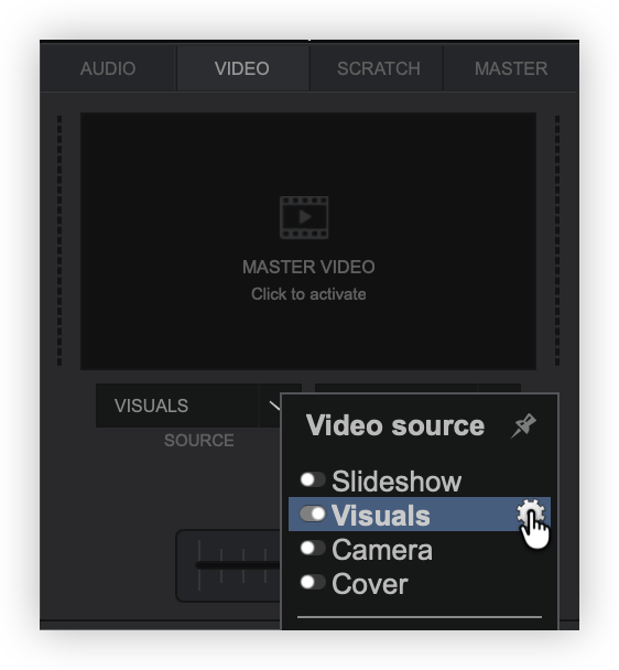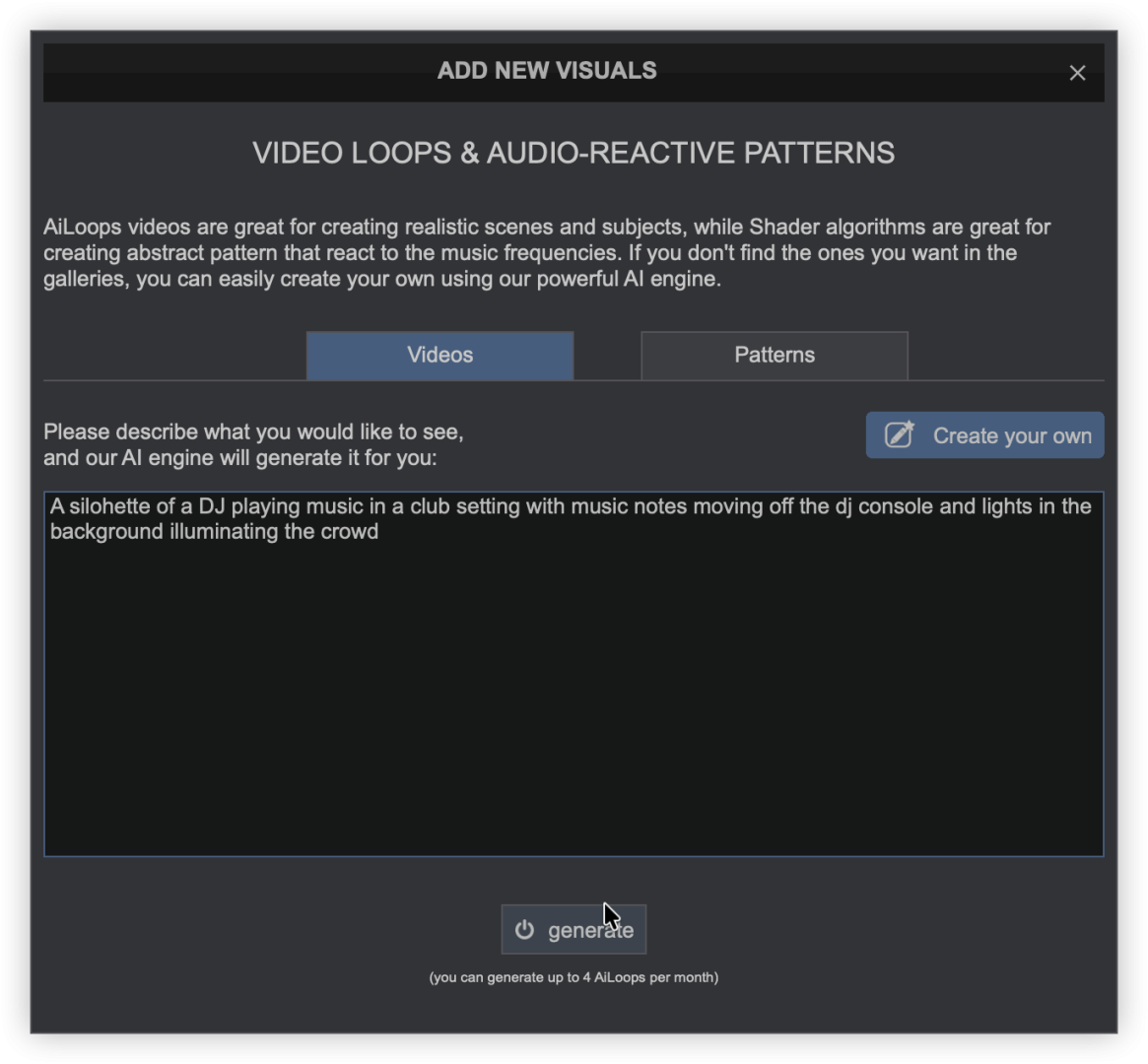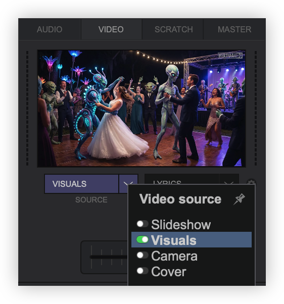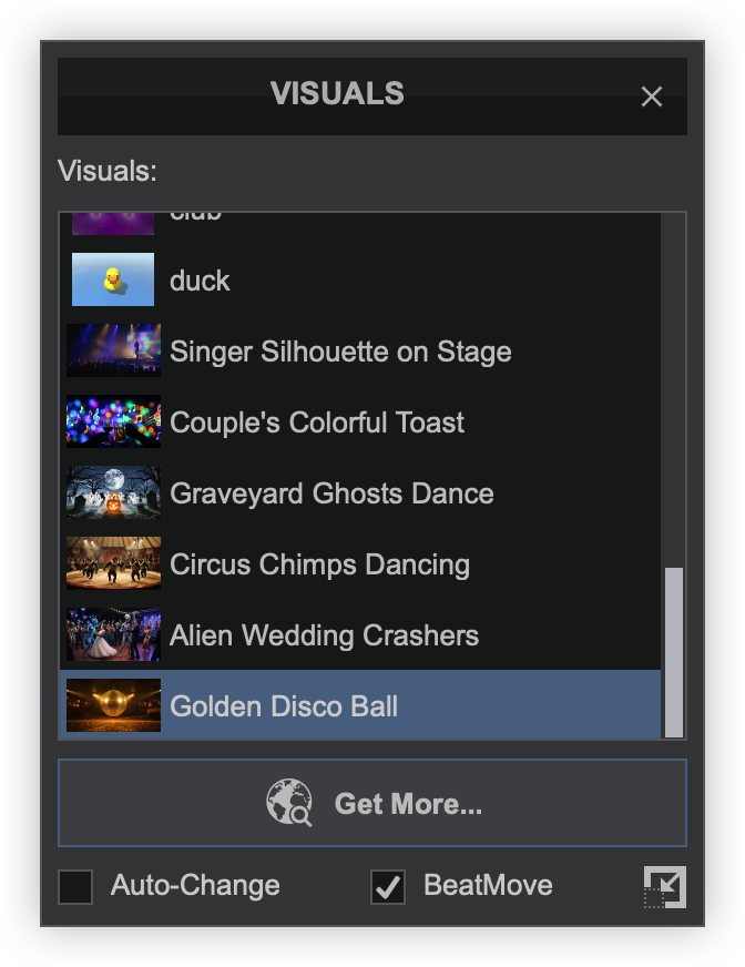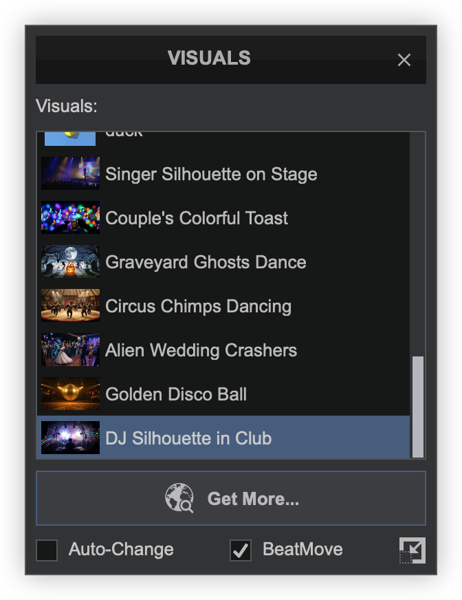 Visuals provide the ability to display AI video loops and audio-reactive patterns on the master video output that move with the music in real time. Visual content can be downloaded from a user-created library or created within VirtualDJ.