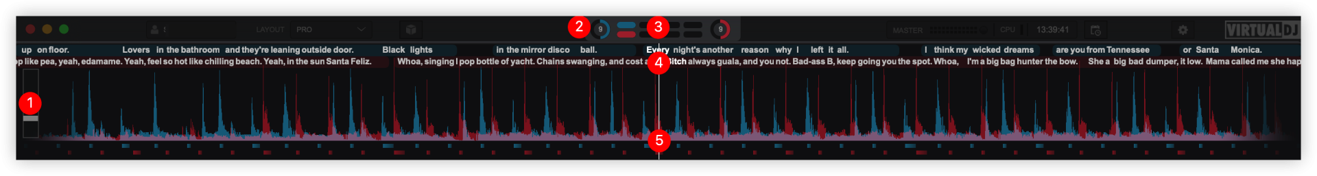 This area tracks the waveform of each song loaded or playing on a deck. It also features a Computerized Beat Grid (CBG) used for visual mixing and beat-matching. A Lyric-Assisted Overlay is also provided to help set cue points, create fun word-play between tracks, or create instant karaoke on the fly.
